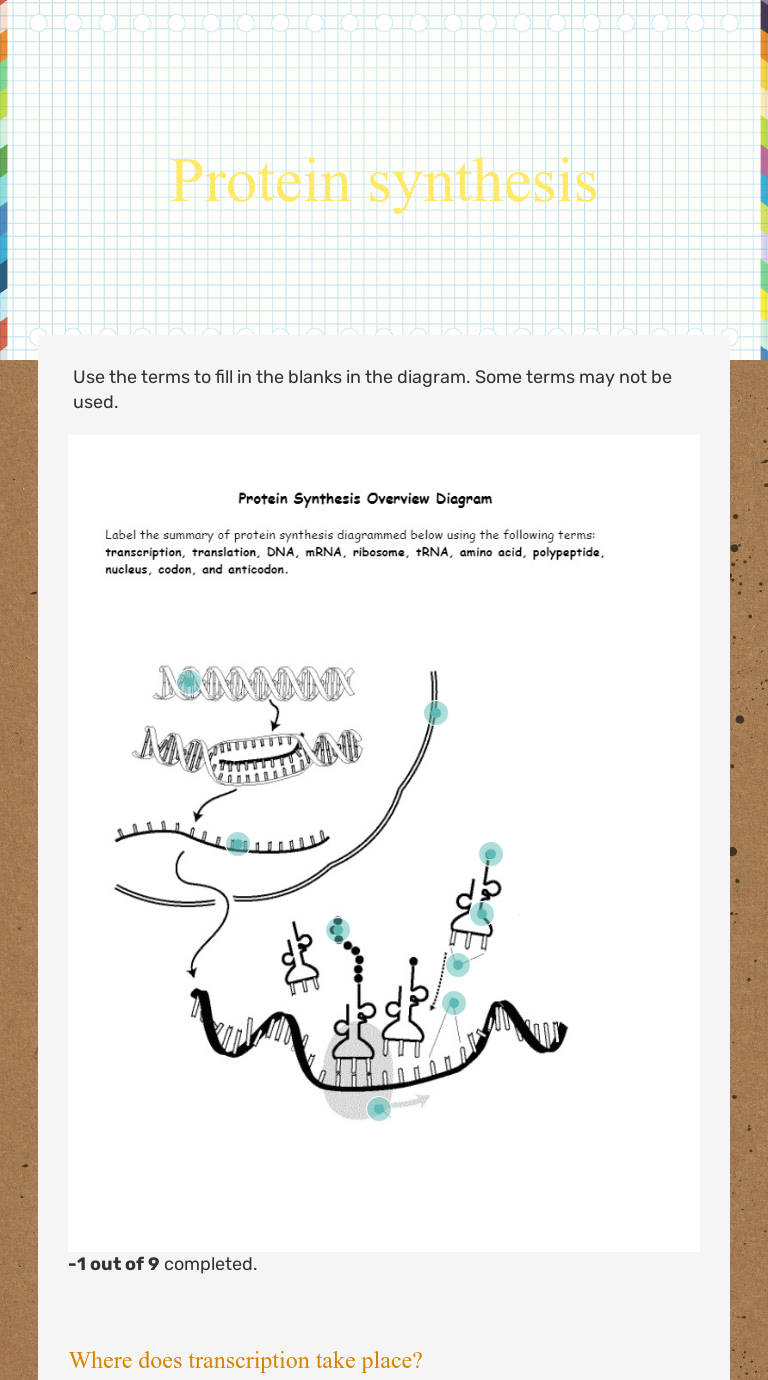 Label each of the 3 major parts. Protein synthesis diagram labeling protein synthesis. Use the diagram below, which shows a summary of the process of protein synthesis, to write the. Transcription is when a dna strand is copied into ______. Use the description diagram below the universal genetic code chart . Interpreting diagrams is an important skill in learning science. What is the purpose of transcription and translation? Translation is when mrna is used to put ______ ______ together. Worksheet 3 dna and protein synthesis. The site of protein synthesis on the ribosome. Let's interpret the diagram by answering the questions. Biology lesson plans, worksheets, tutorials and resources for teachers and students. Transcription, translation, dna, mrna, ribosome, trna, amino acid, .